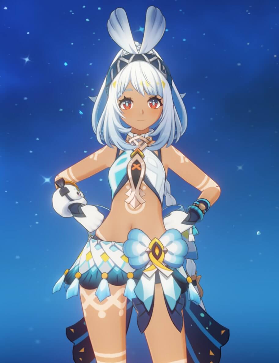 タレ目、褐色、短髪。モーションでは活発な少年の可愛さを存分に味わえます。頭には耳みたいな可愛いヘアバンドを付けているのに対し、体の方は異常なほど肌を露出させており、よりエイチさを引き出している。