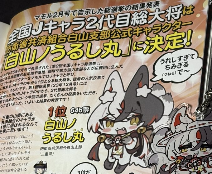 防衛省共済組合白山支部です。「白山ノうるし丸」がダントツの1位だったと聞き、食いしん坊で愛きょうがありかわいらしい一面と、修道者としえ守ってくれそうな一面のギャップが魅力に感じられた結果なのかな、と大変嬉しく思っています。これからも、生粋の三重弁を話しながら、広報活動に励んでほしいです。