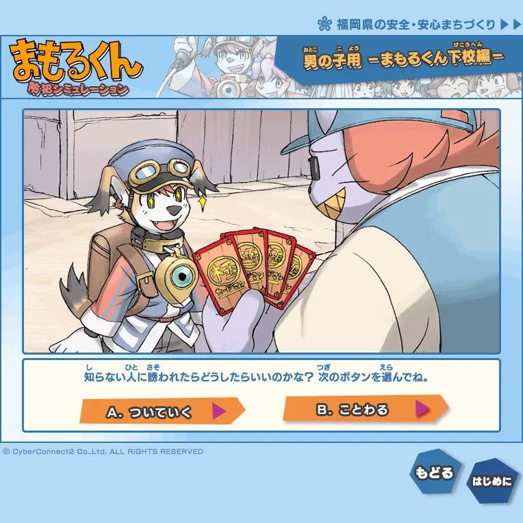 ケモノ・異型ショタ簡単紹介 【防犯シミュレーション】ケモショタのまもるくんがかわいい。 2023.11.222024.05.02 福岡県子供防犯のための『まもるくん防犯シミレーション』のまもるくん まもるくん防犯シミュレーション 超真面目に超健全な防犯シミュレーションをやるだけ【まもるくん防犯シミュレーション】福岡県のサイトに、子どものための防犯教育を目的とした『まもるくん防犯シュミレーション』なるものがある... 超かわいいです バッドエンドもあります。 クリアすると壁紙がもらえます。やったね。 超真面目に超健全な防犯シミュレーションをやるだけ【まもるくん防犯シミュレーション】福岡県のサイトに、子どものための防犯教育を目的とした『まもるくん防犯シュミレーション』なるものがある...