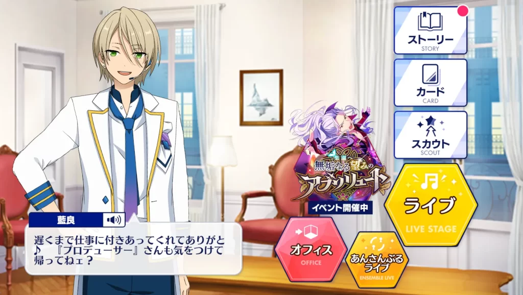 アイドルオタクな藍良。他のアイドルとは大きく異なり、アイドルなのに他のアイドルの大ファンという大胆さ。他のアイドルの挙動全てに良い反応をする。一度アイドル活動がうまくいかなかったことがあり、自身のことは落ちこぼれだと思っている。